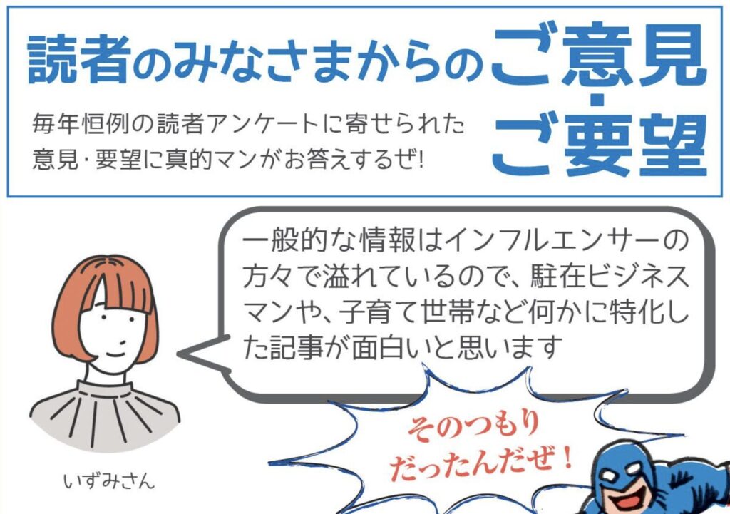 ってなわけで今年も心機一転、読者様からのご意見行ってみよー! なになに、駐在ビジネスマンや子育て世帯など「何か」に特化した記事か、なるほどなあ。えーっと…そうしてるつもりなんだけど、めちゃくちゃ伝わってなかったってことだな…。
