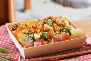 同店の看板料理は、北海道紫ウニや鮪赤身、鯛、イクラ、鰯、関東風鰻、玉子焼きなどを盛り込んだ「海鮮散寿司」(1980元)、北海道赤ウニをはじめ豊富な海鮮を巻き込んだ「海鮮太巻」(2980元)など。また、備長炭の低温調理で仕上げたA5宮崎黒毛和牛を用いた「すき焼き丼」(1100元)、外は香ばしく揚げたA5宮崎フィレ肉の「酥炸和牛」(1380元)を用意。いずれも付け合わせとして和牛ハンバーグを添え、赤酢飯を使用(白飯への変更も可)。