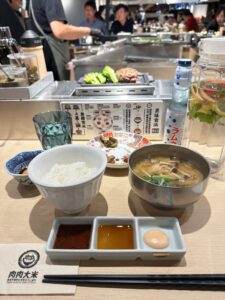 店内にはカウンター34席がライブキッチンを囲み、挽きたて・焼きたてのビーフハンバーグと、店内で精米した炊きたてご飯を提供。ハンバーグはオーストラリア産の和牛を使用した「ハンバーグ2個セット」(380元)、「3個セット」(430元)など。ハンバーグの味はプレーン、チーズと季節ごとに替わる限定の3種を用意し、焼肉ダレやコチュジャン、沙茶醤などオリジナルソース8種と漬物を卓上に備え、好みに合わせカスタマイズできる。