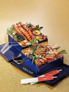 お節は伝統的なお節メニューのほか、豪華海鮮料理まで、料理長が季節の食材を厳選し腕を振るう。「壱の重」には鰆酢橘、栗きんとん、子持ち鮎昆布巻き、ホタテ雲丹焼、和牛有馬煮、車海老艶煮、金箔長寿豆(黒豆)、鮭酢漬大根巻きなど9品、「弐の重」は田作り、玉子カステラ、昆布巻き、数の子、イクラ醤油漬け、六角里芋、紋甲烏賊黄金焼、ヒラメ西京焼、鮑の磯煮、松葉蟹砧巻、炙りカラスミなど全16品を折り詰めた。