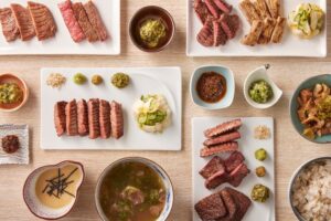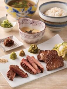 定食はテールスープ、山芋とろろ、白菜の浅漬け、麦飯に青唐辛子の南蛮漬けが付き、タン先の「赤身牛タン定食」(390元/6切、470元/8切、550元/10切)とリーズナブル。またタン元「特選牛タン定食」(590元/4切〜)、タン中「上等牛タン定食」(550元/6切〜)のほか、ステーキメニューも用意。5種類の特製タレと2種の漬物を組み合わせ、一つの定食で多層的な味わいを楽しめる。