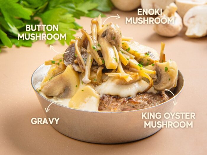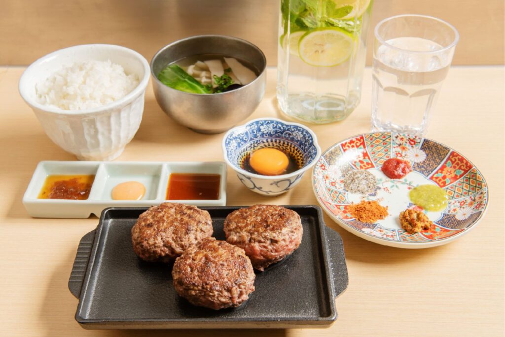 店内にはカウンター34席がライブキッチンを囲み、挽きたて・焼きたてのビーフハンバーグと、店内で精米した炊きたてご飯を提供。ハンバーグはオーストラリア産の和牛を使用した「ハンバーグ2個セット」(380元)、「3個セット」(430元)など。ハンバーグの味はプレーン、チーズと季節ごとに替わる限定の3種を用意し、焼肉ダレやコチュジャン、沙茶醤などオリジナルソース8種と漬物を卓上に備え、好みに合わせカスタマイズできる。