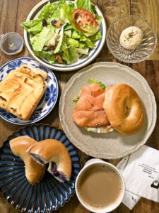 調理が不要なせいか、遠いわりに30分とスピーディ配達。コーヒーを淹れて、早速実食! ウーン、台湾のパンあるあるだけど、ベーグル自体がけっこう甘いかな。でもチーズにタマネギとピクルスのみじん切り、ケッパーが入ってて、酸味が抜群。ブルーベリージャム&チーズは言うことなし、果粒たっぷりで濃厚で…太るね、うん。よし! 気持ち切り替えてサラダ食べて、そうだベーグルもドーナツみたいに穴空いてるからカロリーゼロだ!