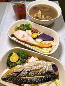 というわけで、前から目を付けていた健康スープと弁当の店からデリバリー。ツルドクダミ「何首烏」と鶏肉、ハマグリを煮込んだスープ、それから魚も食べとかないとね。好きなのは鮭だけど、ここは銀色のサバも頼んじゃおう。