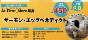 休日の朝(っていうか昼)はブランチが食べたい私と、ソレジャナイ感を醸しだすパートナー。思い思いに好きなものが食べられる~と喜んだものの、あっ待てよ、ステーキが乗ったパスタもおいしそう、オムレツセットにはヨーグルトが付いてるな…と甚だしく目移りしながらも無事注文。私は初志貫徹でスモークサーモンのエッグベネディクト、相棒はキムチ豆腐チゲに。あとフレンチトーストが〝買一送一〟だったので、追加しちゃった。
