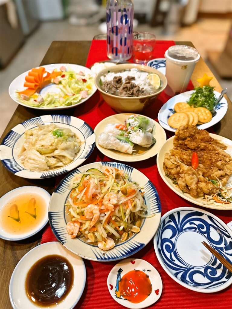 ナベ子先生が用意してくれたニンジンリボンのサラダと、ツリー形クリームチーズ&クラッカーも合わせてパシャリ。麺も伸びてないし、生春巻はフレッシュ、椒麻雞はチキンだから思いがけずめっちゃX’mas。ベトナムの家庭も今夜はこんな感じなのかな〜とおしゃべりに花が咲き、気づくと日付が変わっていました。最高なX’masディナー、ありがとー!