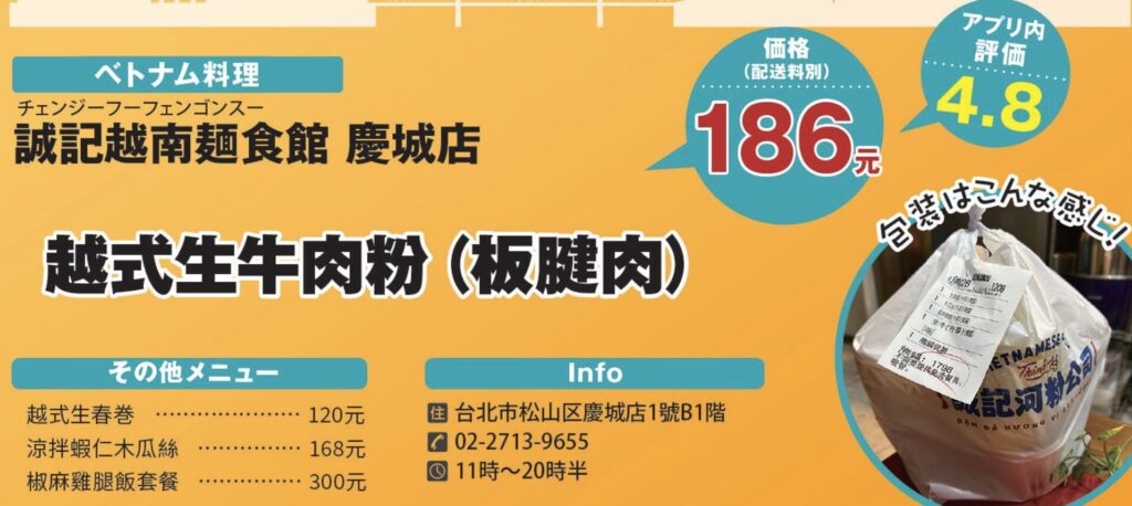 このところUberEatsばっかだったけど、たまにはとFoodpandaアプリを開きご飯と麺を1つずつ、絶対欠かせない青パパイヤのサラダと生春巻も入れてポチリ。届くまでに階下のコンビニでドリンクを購入していたら、あっという間に到着したのでお外で受け取ります。配達員のおじさんと「生誕節快楽〜」なんて交わすのも台湾らしくてよき。日本じゃデリバリーで「メリークリスマス! 」とか言わなさそう(笑)。