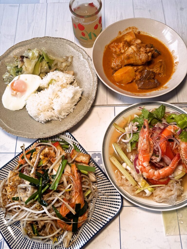 料理をテーブルに並べてみると…おお~色味の強い料理は映えるね~。クイティアオは甘さと塩気が同時に来て、後からじわっと辛みが追いかけてくる。エビやイカの旨みにシャキシャキのもやしと砕いたピーナッツ。レモンを絞ると味の輪郭が締まるね。