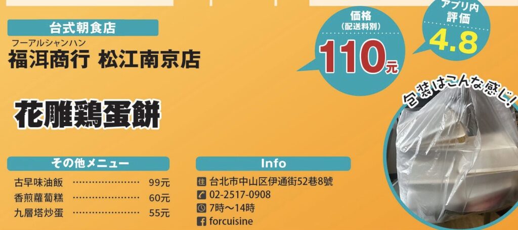 【今週の外送!!デリバリー】Vol.130 福洱商行 松江南京店の花雕鶏蛋餅(台式朝食店)