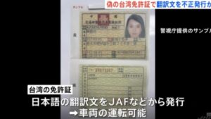 日本では、台湾やドイツ、フランスなど日本と同程度の免許制度を持つ国と地域の免許保有者に対し、領事機関や日本自動車連盟が発行する免許翻訳文を携帯することで国内の運転を承認。2人がJAFに翻訳文を申請したところ、JAFが同一人物による不審な複数回の申請を確認し、警察に通報したことで事件が発覚した。2人は中国の通販サイトを通じ、1枚16万円相当で台湾の免許証を入手したものの、偽造とは知らなかったと一部容疑を否認している。