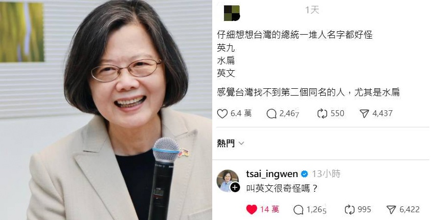 蔡氏は昨年の退任後もSNSでの発信を続けており、若者に人気の「Threads」では、投稿に直接コメントすることもある。今回注目を集めた投稿では、陳水扁、馬英九、蔡英文の3人を挙げ「台湾の総統の名前は妙に独特で、同じ名前の人をなかなか見かけない」と指摘。これに対し、蔡氏本人が1月20日(火)夜「〝英文〟という名前はそんなに変ですか?」とコメント。思いがけない本人登場に、投稿は瞬く間に拡散され、14万件を超える「いいね」が集まった。
