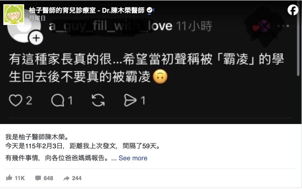 医師でインフルエンサーとしても活動する「柚子醫師」こと陳木栄氏が2月3日(火)、娘が在籍する学校で同級生から暴力を受けた件で、調査の進捗状況と学校側の対応を自身のSNSに投稿。調査期間の延長に加え、学校側からクラスの全生徒に謝罪するよう求められたとして、対応に強い疑問と不信感を示した。